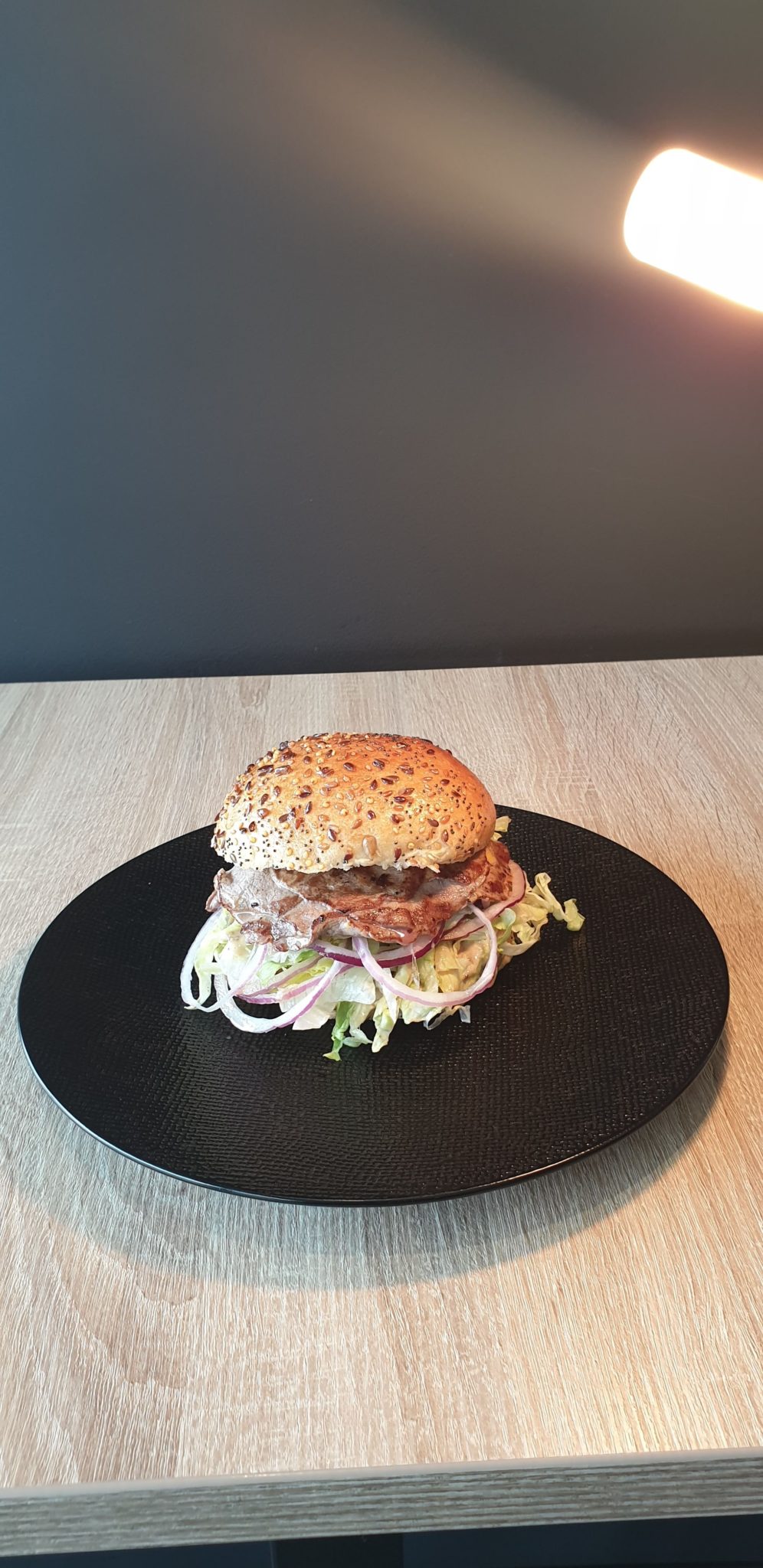bun’s, sauce béarnaise, steak haché Limousin, bacon, cheddar rouge, oignons rouges, salade de saison